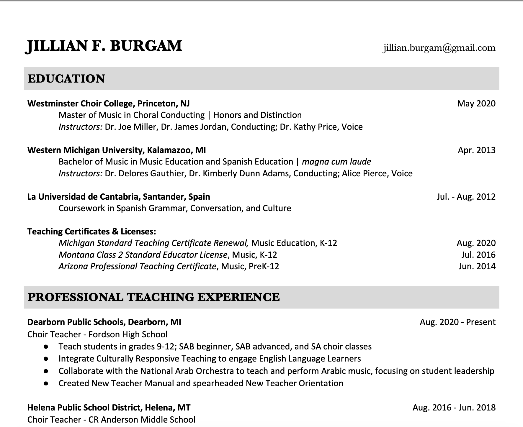 Jillian Burgam is a Lecturer of Choral Music at Eastern Michigan University where she conducts the EMU Voices, EMU Campus Choir, and teaches music education courses. Prior to her work at EMU, Jillian taught for 10 years in public middle schools and high schools all over the country. Working in Wickenburg, AZ, Helena, MT, and most recently at Fordson High School in Dearborn, MI, Jillian’s choirs have earned superior ratings at solo, ensemble, and choral festivals alike, and have had singers qualify for regional, state, and all-state honors choirs. Most importantly, her work in public education has focused on Culturally Responsive Teaching and engaging English Language Learners. Among her fellow educators, she has focused on advocating on behalf of new teachers, developing a Mentorship program at Wickenburg High School and a New Teacher Orientation at Fordson High School.